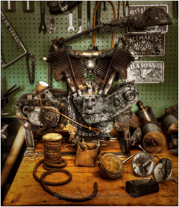 I was in Le Claire - Iowa yesterday visiting American Pickers store. Took a few snapshots, and I liked this one a little bit. I wish the engine was farther from the wall so that it does not blend in as much as does, but I was not in the situation to "set up" the shot. Any thoughts?