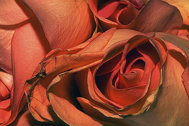 My wife received some roses from her boss (sorta boss, if you know what I mean) and the fell apart as soon as she got home. I found the remains interesting and shot this.