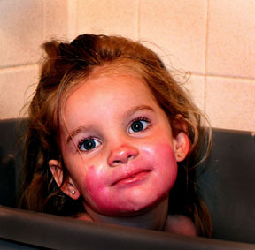My wife left me alone Firday night whilst she went to "play cards" with the girls, Leah had some new lip-gloss and I set her up to watch a movie...when I checked on her...BAM..she had applied the gloss to her face...hands...legs and feet...WOW!
