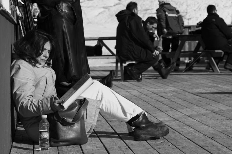 Taken outside the chalet at the local ski hill. The sun was warm enough to want to stay outside, and this woman was settling in for some quiet time with a book.