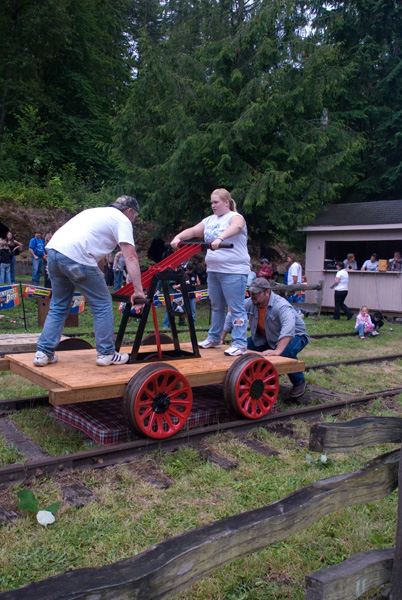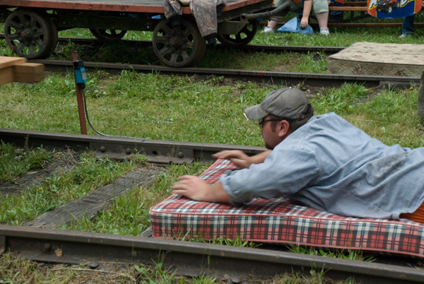 The second shot is an example of what we were shooting. Note the mattress under the handcar. Third picture shows why its there. Pushers are highly motivated.